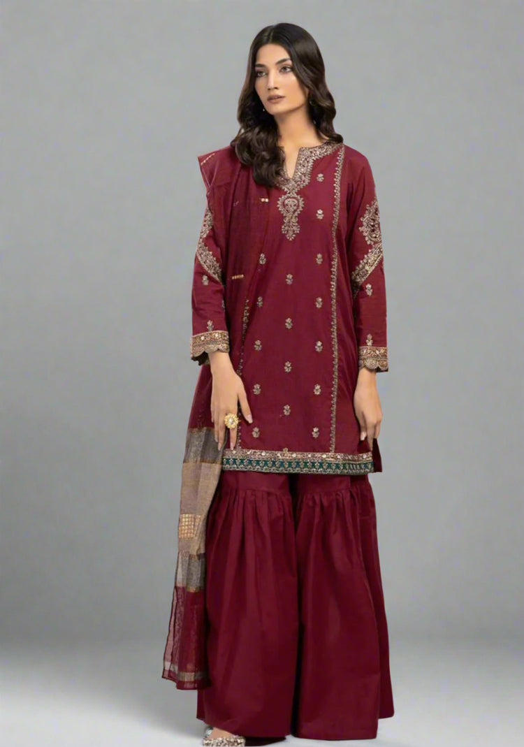Enhance your ethnic collection with this 3 Pcs Women's Unstitched Maroon Lawn Suit. The shirt features detailed embroidery on the front, neckline, sleeves, and daman, paired with a plain back for a refined look. Complete the outfit with a plain lawn trouser and a digitally printed Diamond fabric dupatta, offering a perfect blend of elegance and comfort for festive occasions or casual gatherings.